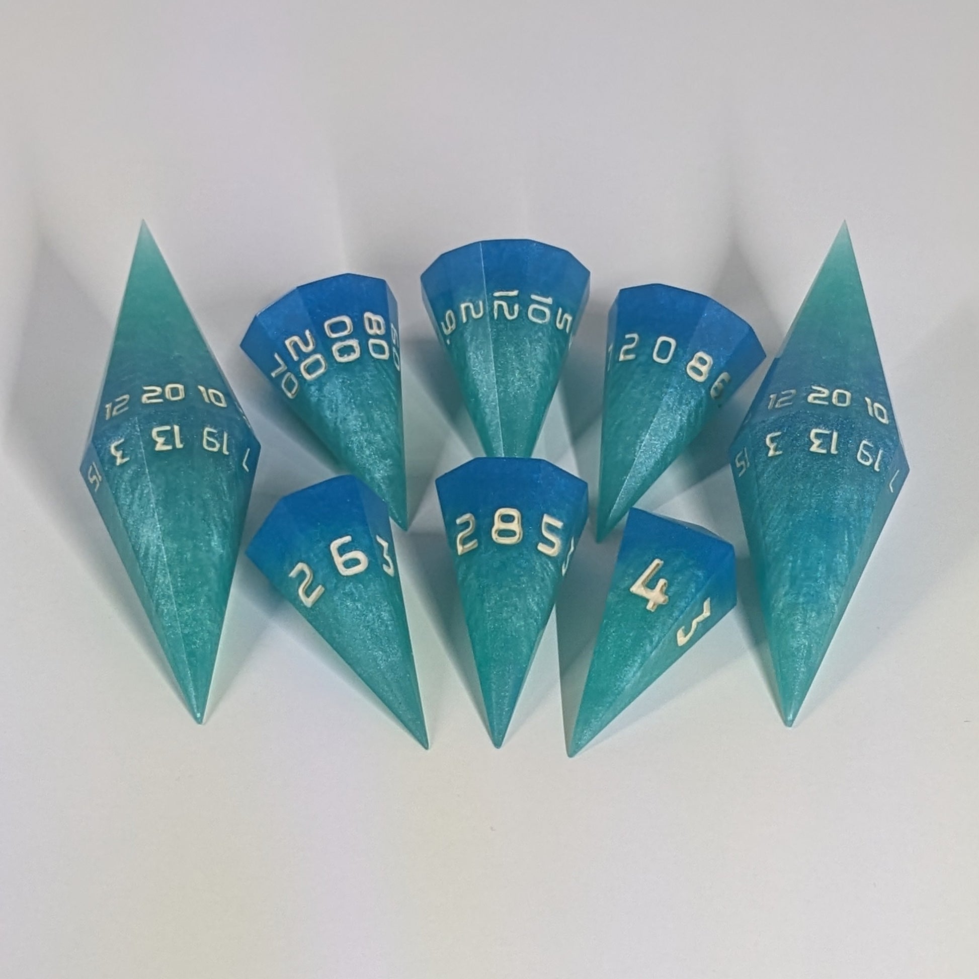 Cool blues and seafoam greens ripple like waves caught in motion. These dagger dice feel like treasures plucked from the ocean floor; elegant, fluid, and dangerous.
